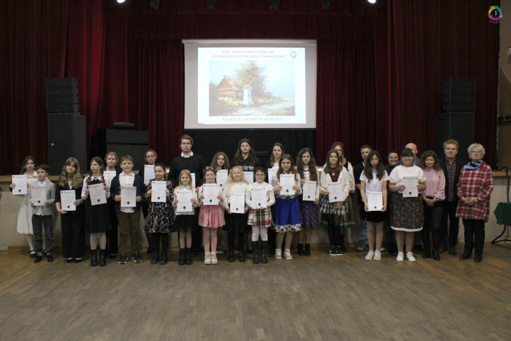 18 listopada 2025 roku w Miejsko – Gminnym Ośrodku Kultury w Jadowie odbył się XXIV Powiatowy Konkurs Interpretacji Polskiej Twórczości „Tradycja Słowem Opisana”. W konkursie udział wzięło 51 wykonawców. Komisja w składzie: Marek Ravski przewodniczący komisji – wokalista, aktor, lektor, trener głosu w zakresie emisji, artykulacji, melodyki, frazowania, Małgorzata Raczyńska – polonistka, Małgorzata Januszewska – dyr. ZSP im. Janusza Korczaka w Urlach, Aneta Kowalczyk – koordynator zajęć w MiGOK Łochów po wysłuchaniu wszystkich uczestników konkursu postanowiła przyznać następujące miejsca i wyróżnienia: w kategorii RECYTACJA klasy I – IV nagrody otrzymali: 1. Mikołaj Wujek, MOK Ząbki, 2. Lena Ziółkowska, ZSP Urle, 3. Nadia Szyszko, ZSP Urle, wyróżnienia otrzymały: Zofia Michalik, ZSP Urle, Alicja Wronowska, ZSP Urle. W kategorii RECYTACJA klasy V – VIII nagrody otrzymali: 1. Julian Mikulski, Pogotowie Poetyckie / ZSP Urle, 2. Paweł Rybiński, Pogotowie Poetyckie / ZSP Jadów, 3. Konstancja Loda, MOK Ząbki, wyróżnienie Nadia Oniszk, ZS Mokra Wieś. W kategorii RECYTACJA szkoły średnie nagrody otrzymali: 1. Maciej Król, Pogotowie Poetyckie / ZSP Łochów, 2. Jakub Tarnowski, MOK Ząbki, 3. Maja Kukla, MOK Ząbki, wyróżnienie Martyna Szymkiewicz, ZSP Łochów. W kategorii PIOSENKA klasy I – IV nagrody otrzymali: 1. Aleksandra Szydłowska, SP w Dąbrówce, wyróżnienie: Julia Oniszk, SP Myszadła. W kategorii PIOSENKA klasy V – VIII nagrody otrzymali: 1. Maria Świętoń, MGOK Jadów, 2. Jagoda Gołębiewska, MGOK Jadów, 3. Kamila Ciszewska, ZSP Jadów oraz Laura Oniszk ZS Mokra Wieś. Wyróżnienie: Alicja Laszczka, MGOK Jadów. W kategorii PIOSENKA szkoły średnie nagrodę otrzymali: 1. Maja Kalinowska, ZSP Jadów 2. Mateusz Głód, LI LO Warszawa Jury w tym roku nie przyznało nagrody Grand Prix. Dyplomy i nagrody uczestnikom konkursu wręczyli: burmistrz Rafał Rozpara, dyrektor MGOK Jadów Magdalena Donoch oraz członkowie jury. Gratulujemy wszystkim nagrodzonym i zapraszamy na kolejny, jubileuszowy konkurs.