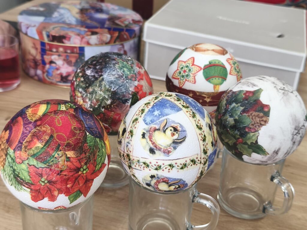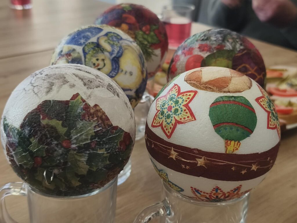 20 listopada odwiedziliśmy po raz kolejny Klub Seniora w Nowinkach. Tym razem robiliśmy decoupage na styropianowych bombkach.